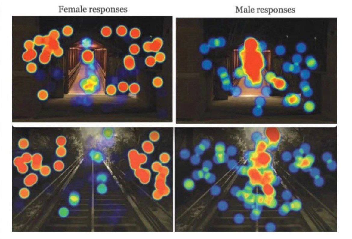 Выяснилось, что мужчины чаще всего концентрируются на объектах, расположенных непосредственно перед ними, и на хорошо освещенных участках. Это похоже на то, как они фокусируются на цели, игнорируя периферию. Женщины же, напротив, уделяли больше внимания периферии: кустам, темным участкам и другим потенциально опасным зонам.